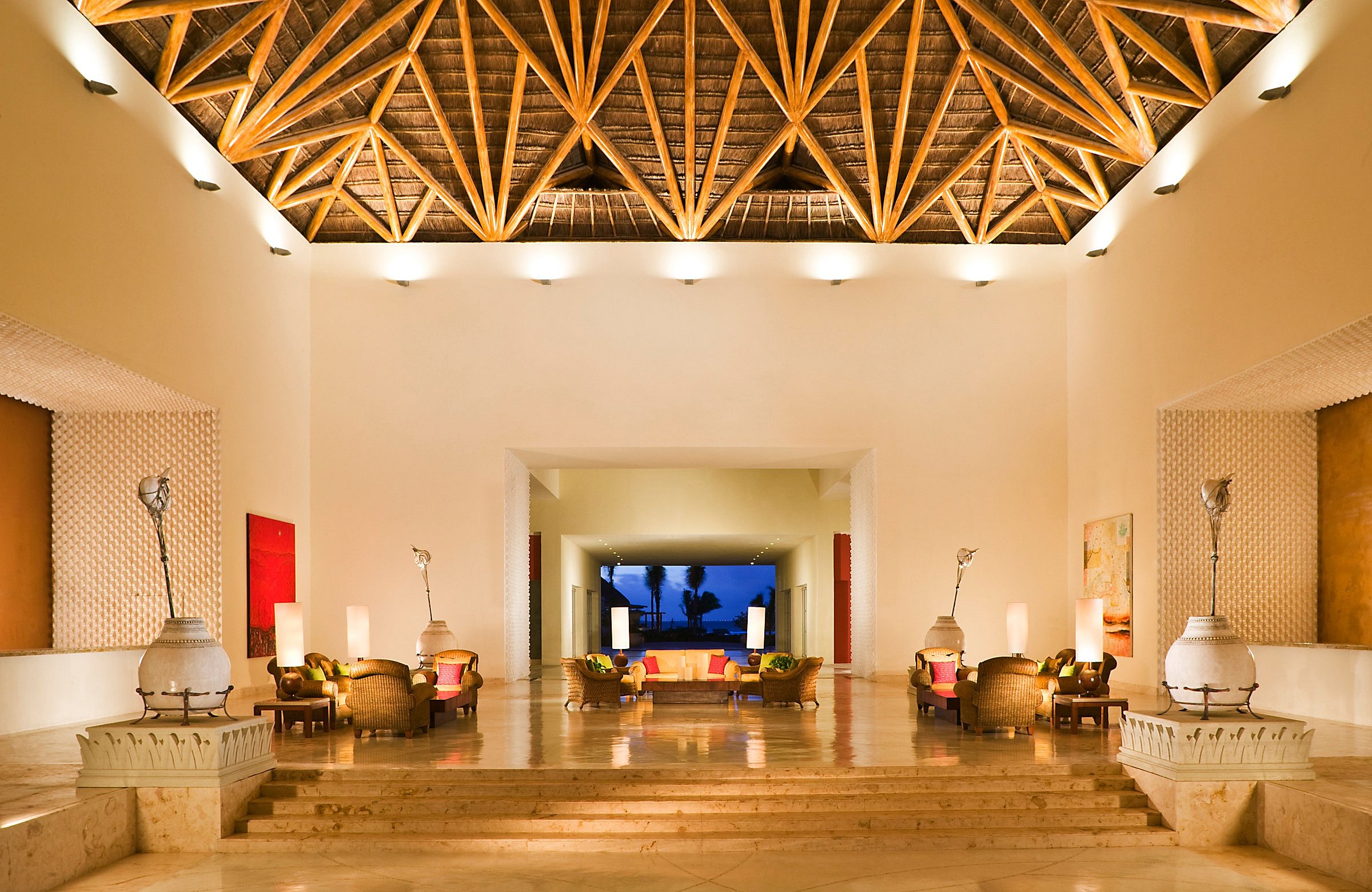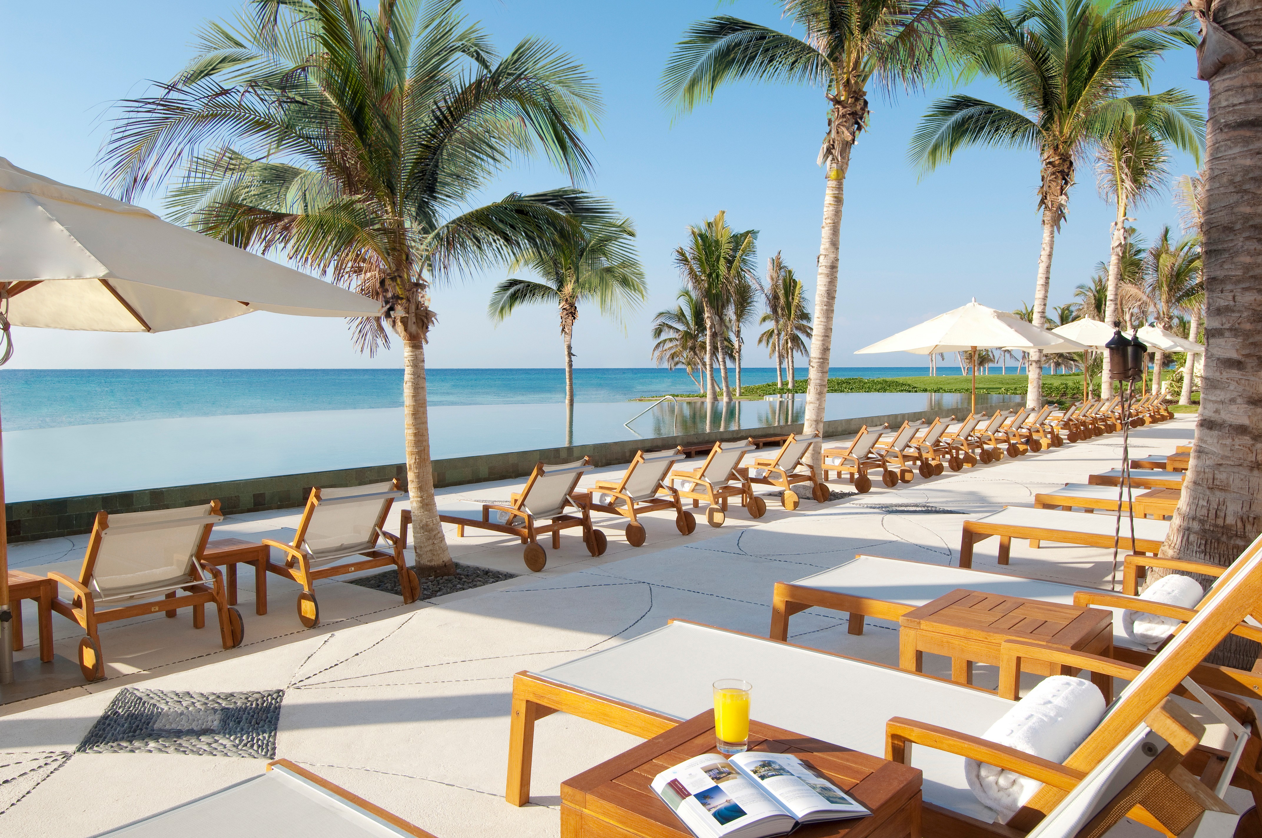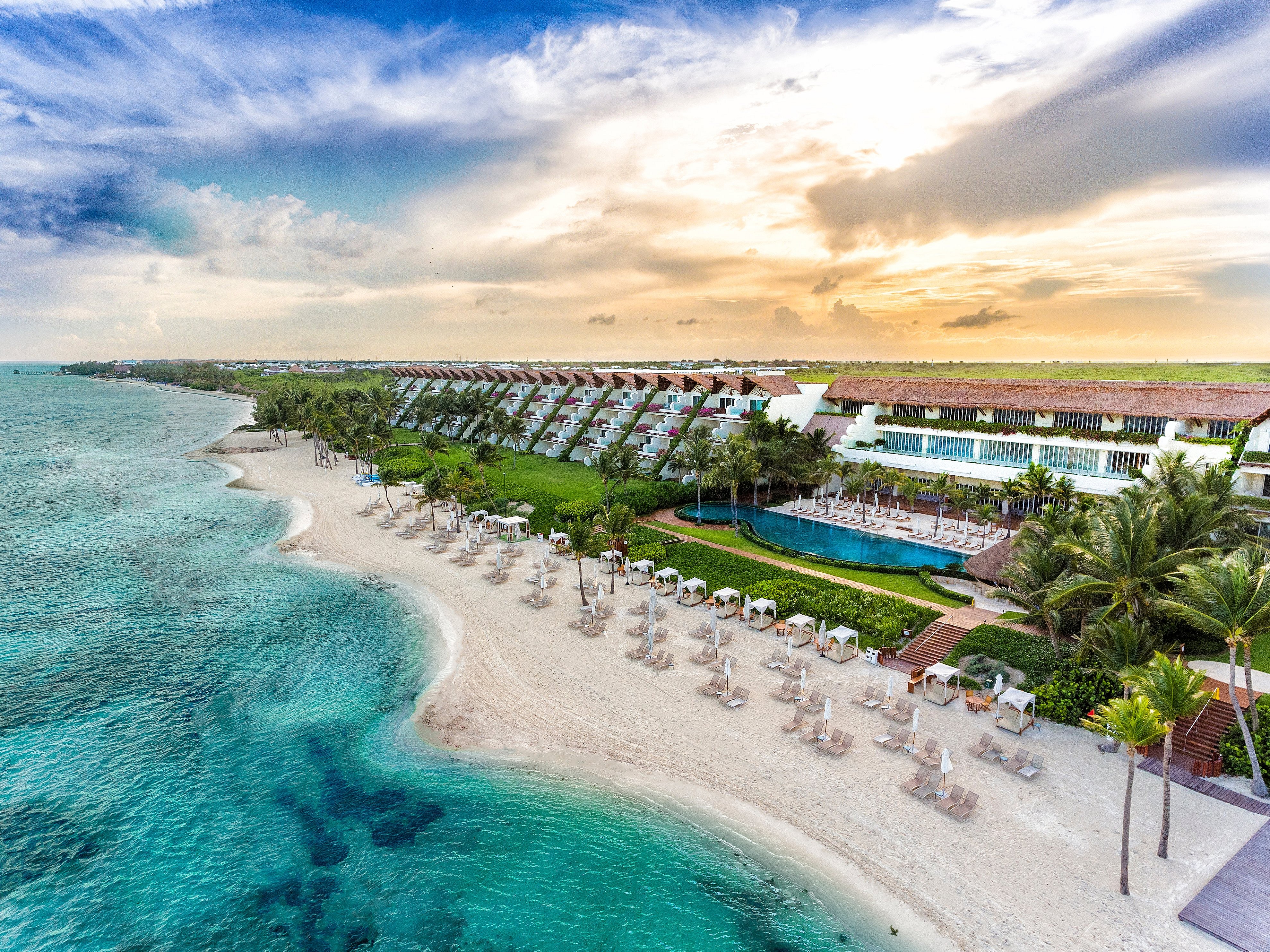 Upon entering, there’s a long road through the Yucatán jungle that leads to one of three massive properties and, through the airy lobbies, a pristine beach with water that remains confoundingly clear as you wade into the sea.