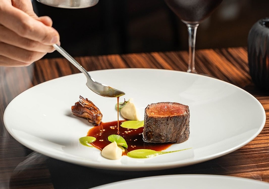 As for menu highlights, “A farm-raised sea scallop served under a miso butter with tom yum and a tempura-fried shiso leaf is delicious,” the Guide reports. “Then, in a triumph of flavors, beef tenderloin is plated with celery root purée, poached beets, and maitake mushrooms. Shaved Comté with a quenelle of honey ice cream is a playful take on the cheese course [to finish].”