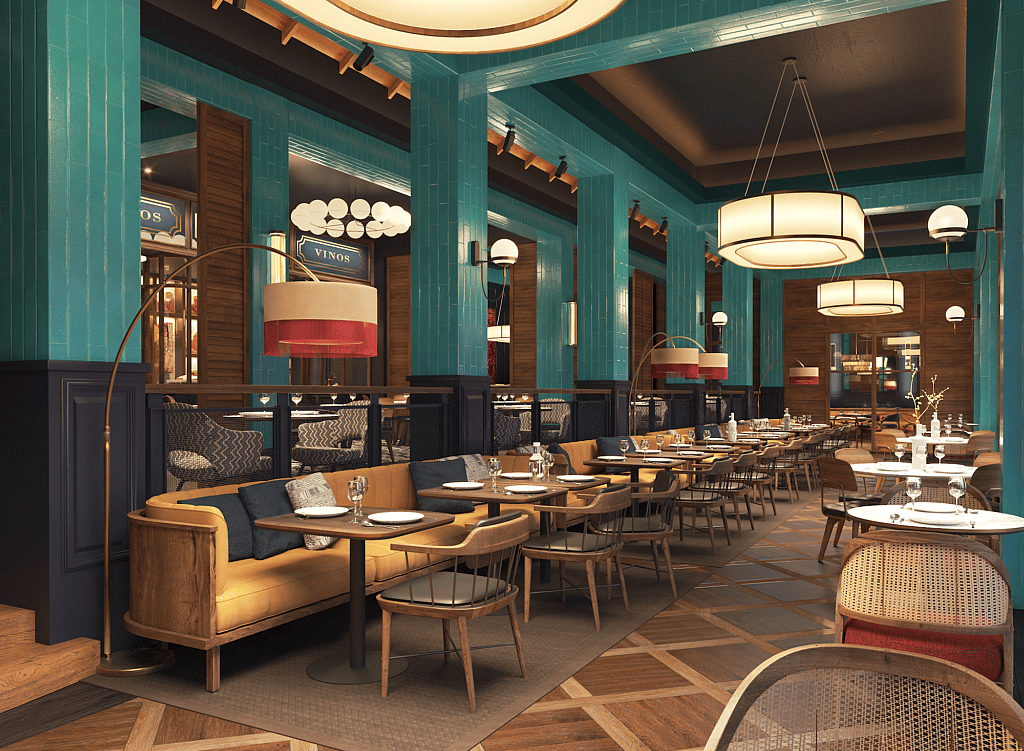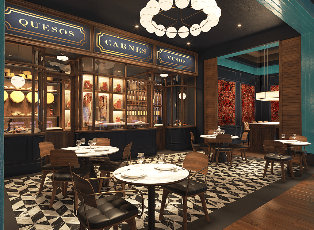 Tauro steakhouse is another culinary and design triumph, an elegant combination of “savage and sophistication”—i.e. classic steakhouse offerings but with Mexican ingredients and flavors. It features prime cuts, an in-house dry-aging program, a raw bar, and a Martini Bar, with an interior design scheme intended to “evoke a modern speakeasy with Parisian influences.”