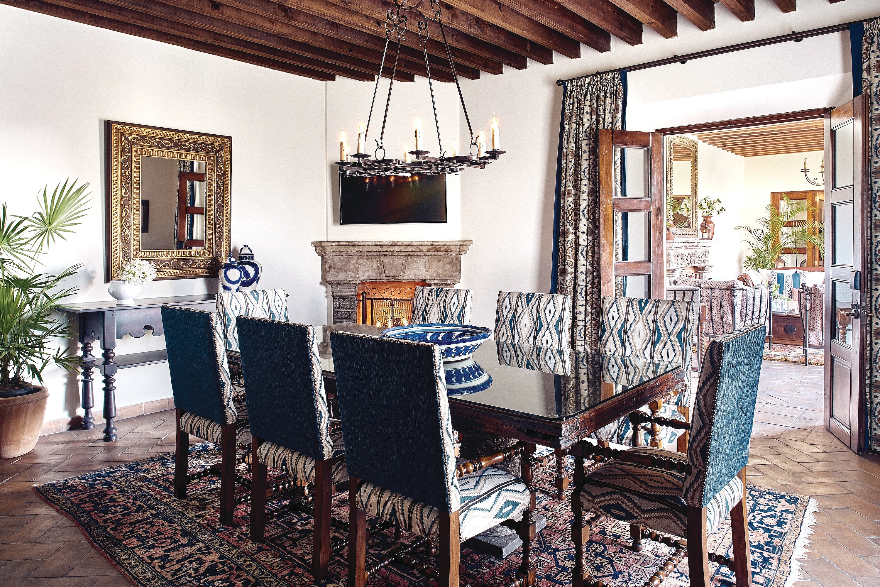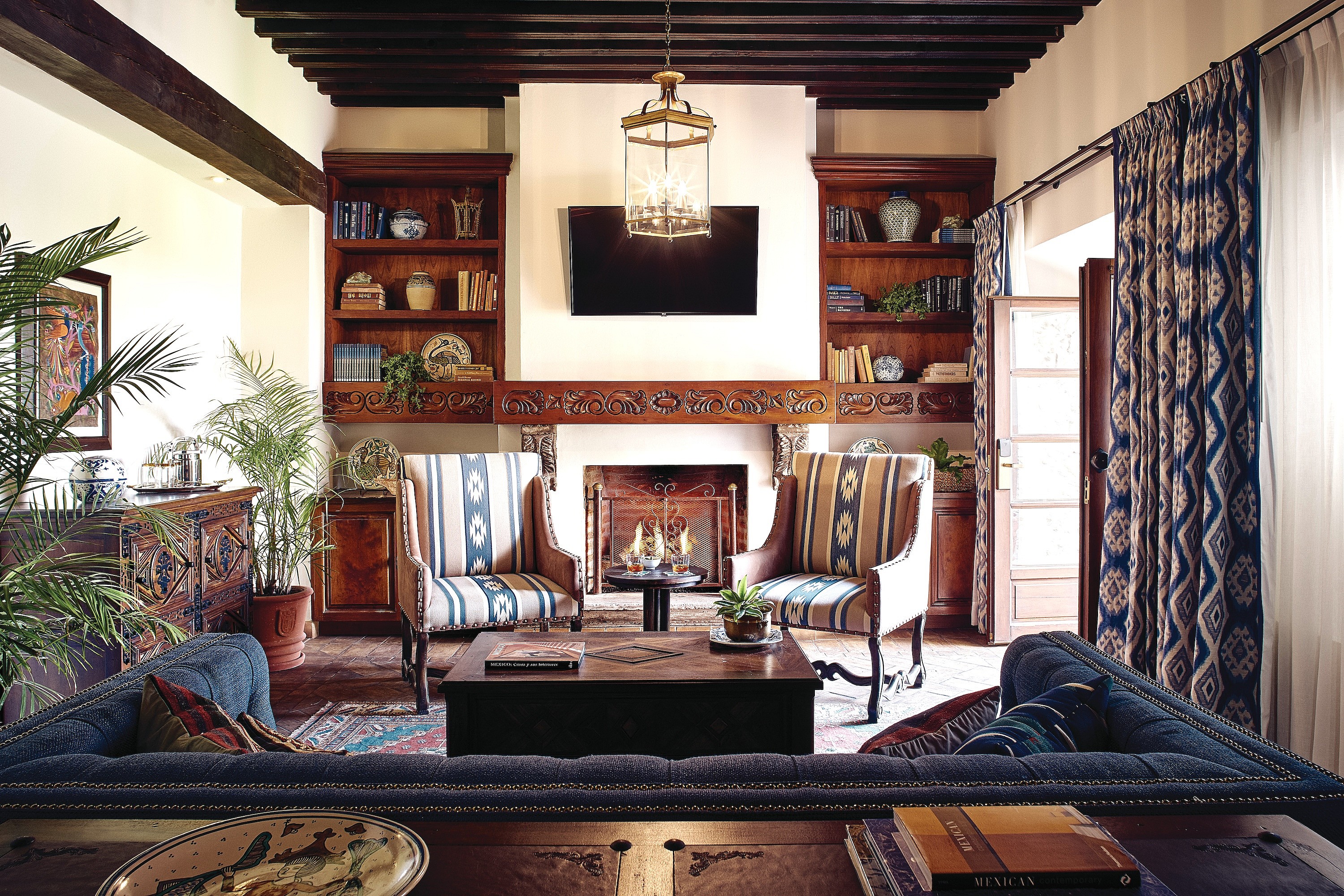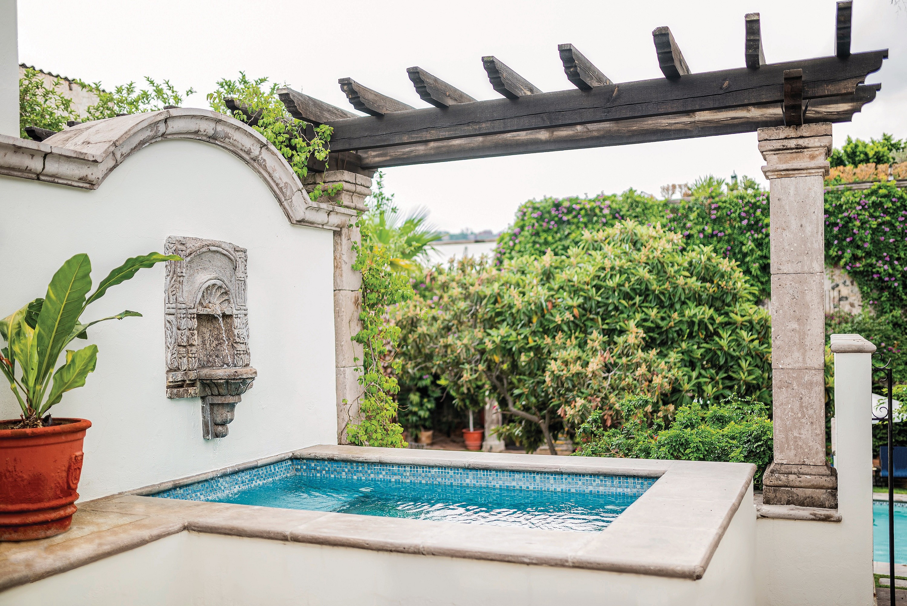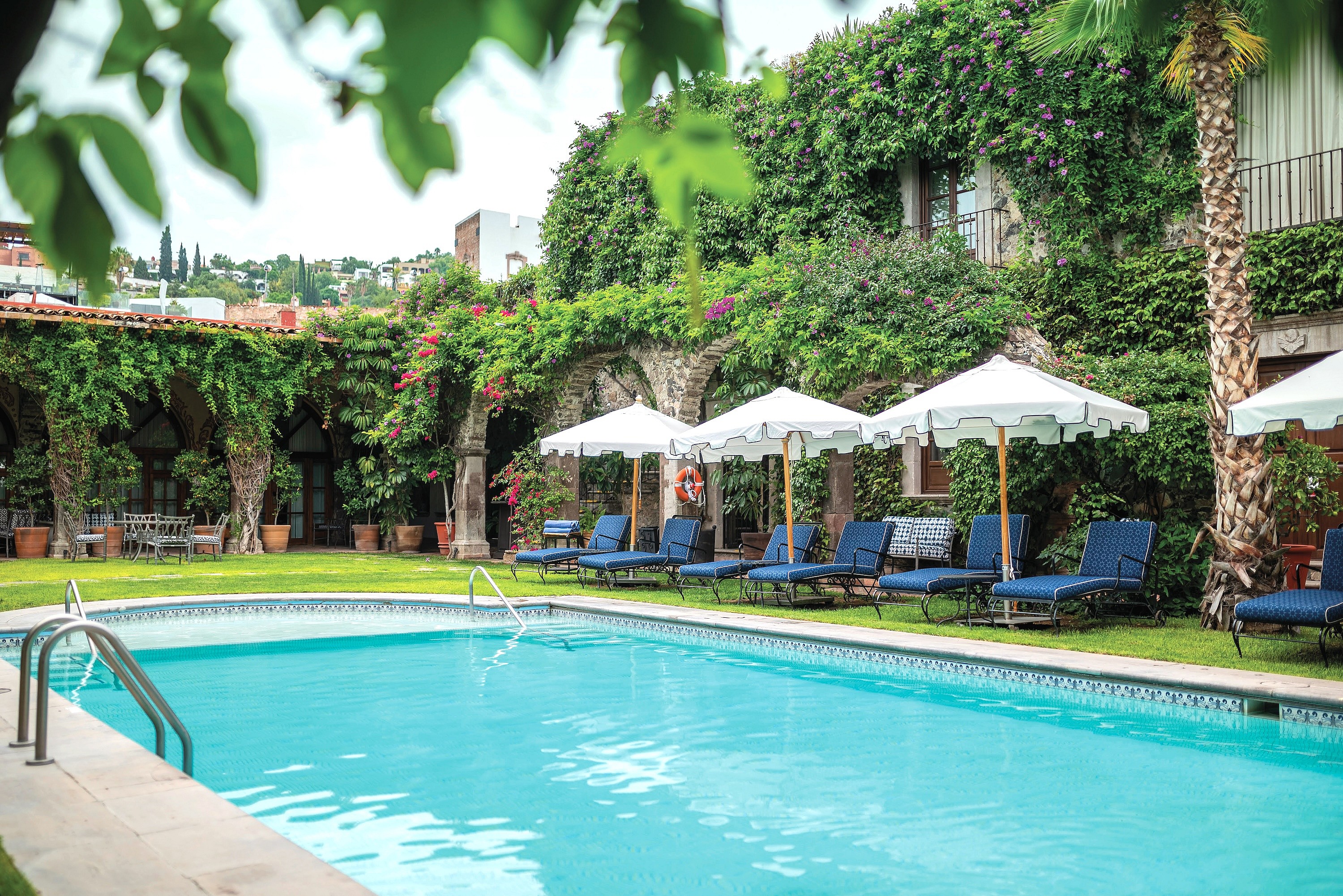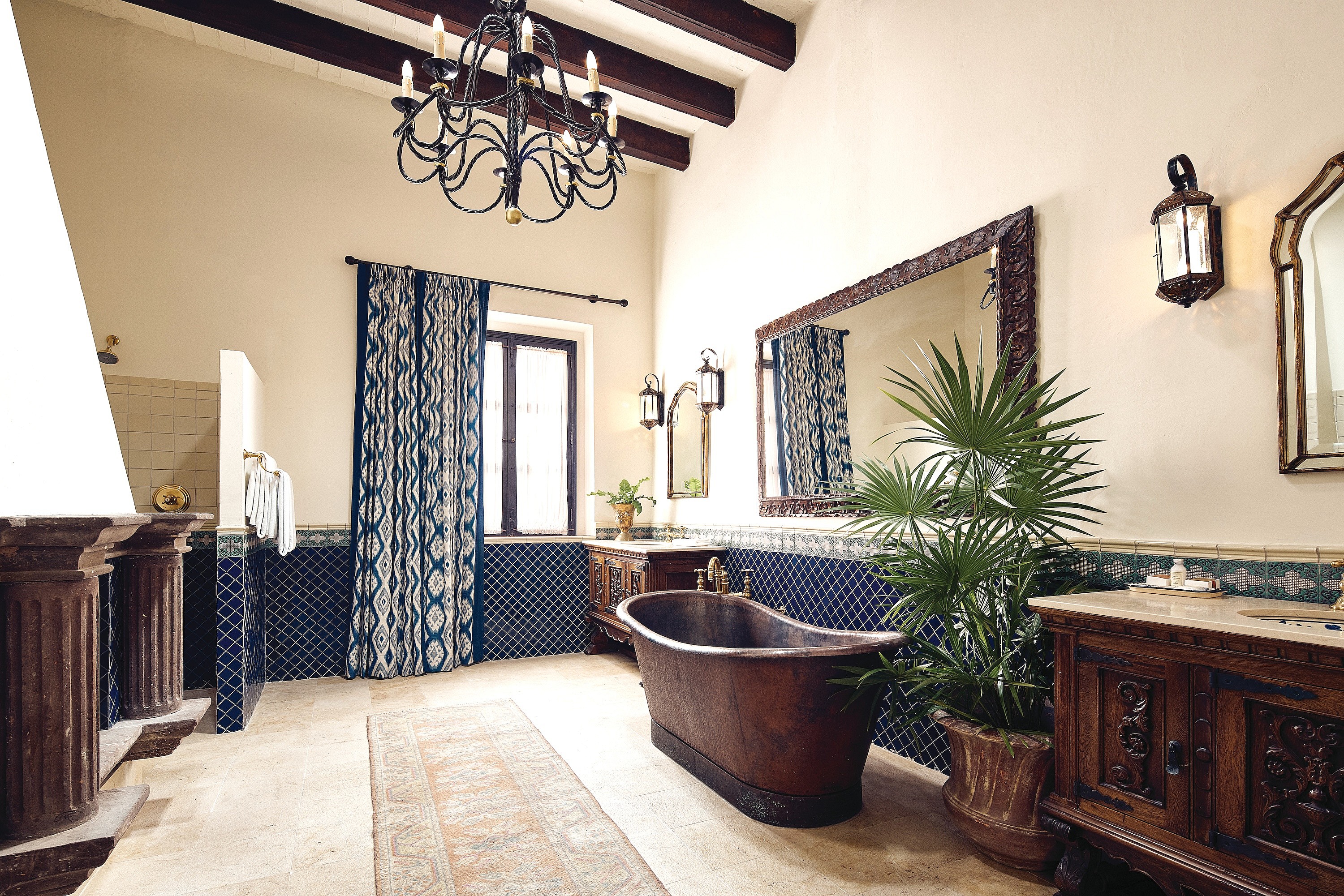 These entertaining spots are just as unique as the hotel’s expansive rooms and suites, of which no two are alike. All feature antique furnishings in the Mexican colonial style, and paintings by local artists. Some have rooftop patios with plunge pools and working fireplaces. Characteristic of the city’s architecture, there are shaded courtyards, trickling fountains, vaulted archways and ancient stucco details. Blue and white fabrics and bronze bath fixtures are beautifully offset by handmade tile and ceramics.
