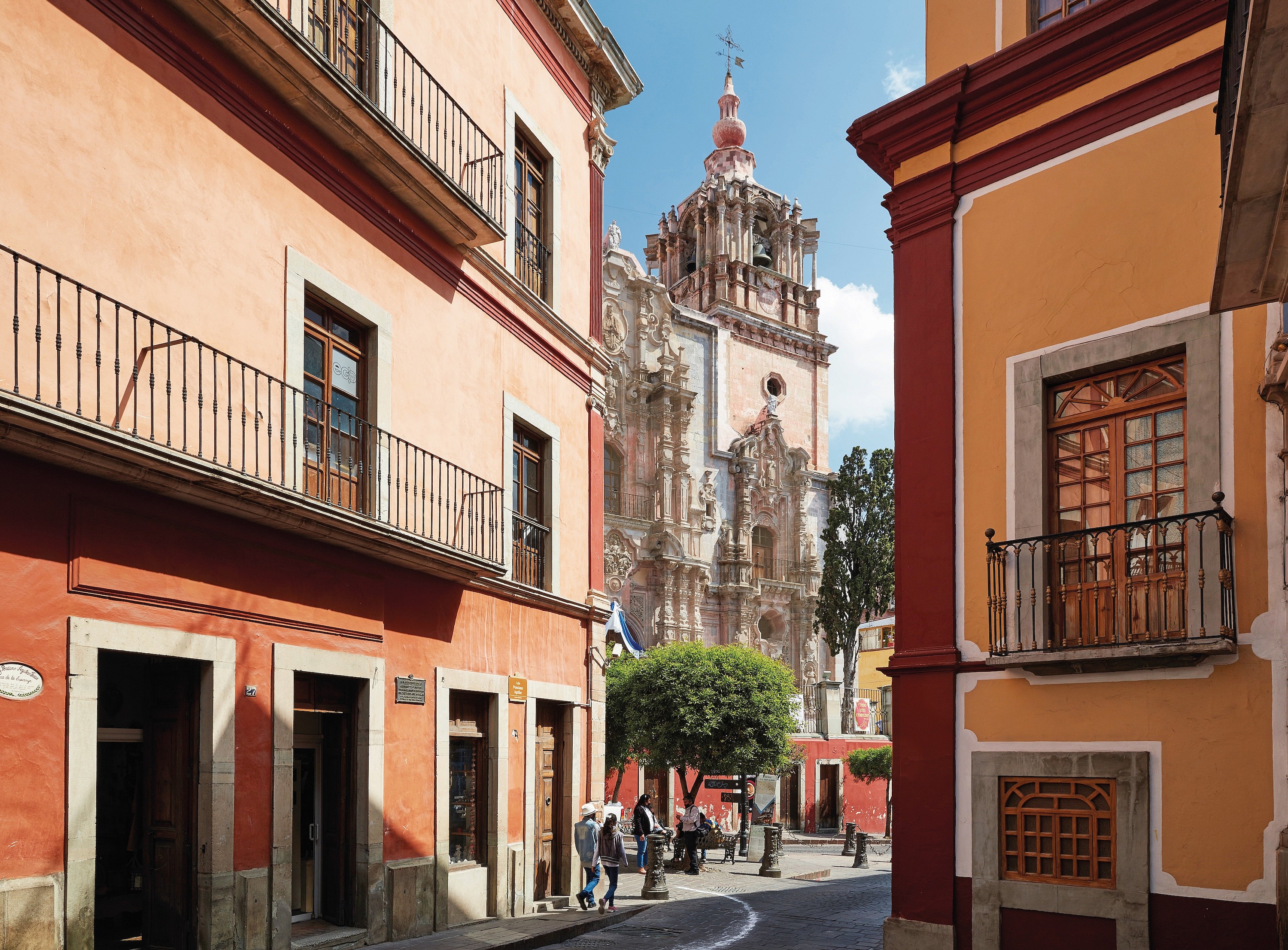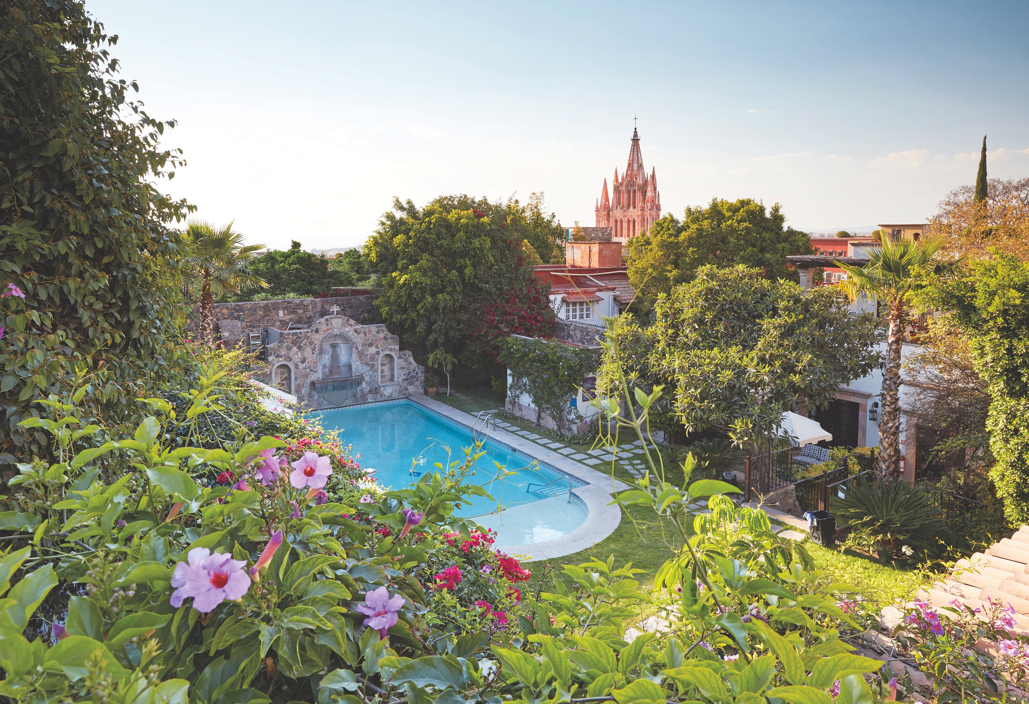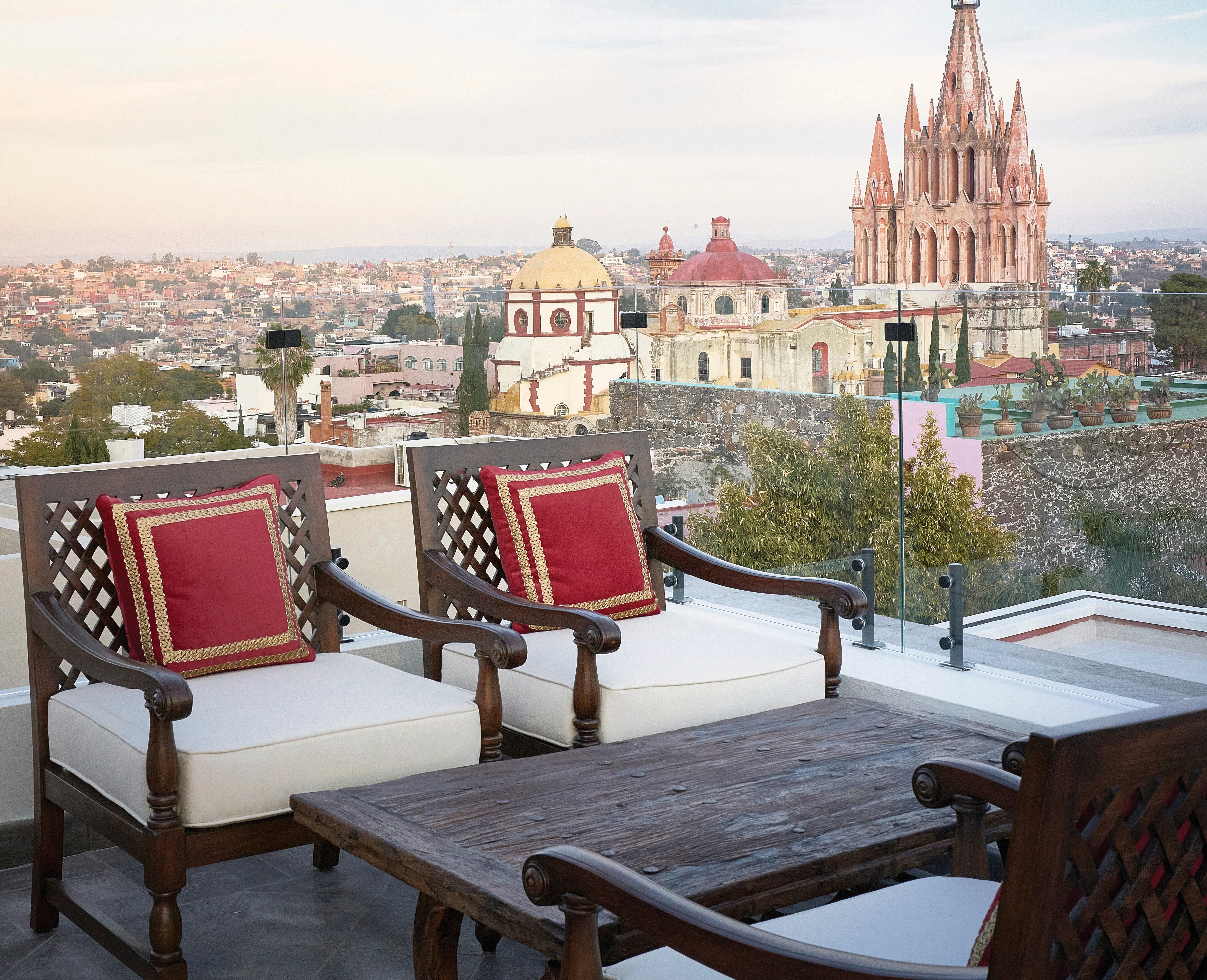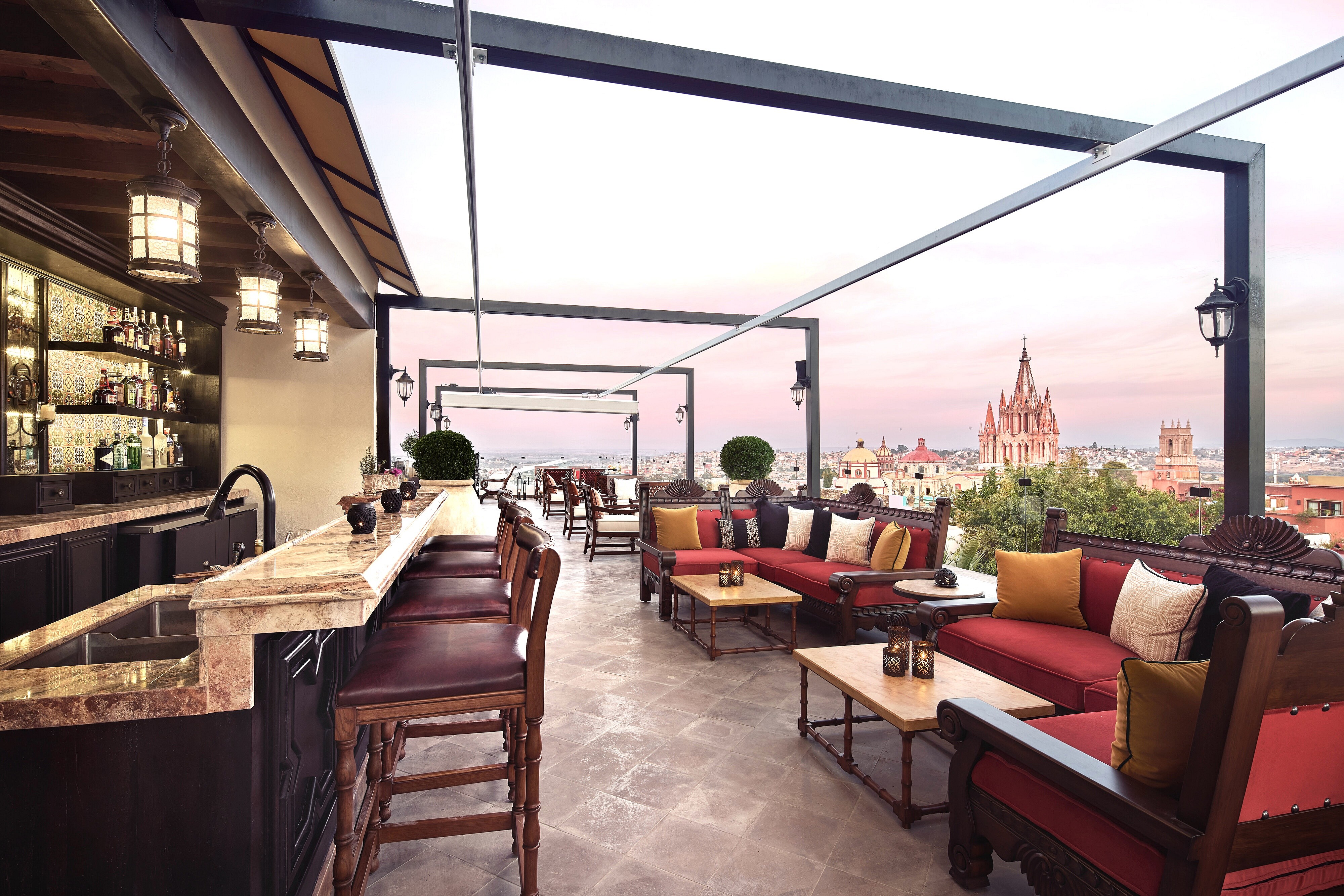 The locally carved timber-and-tiled bar only seats four on saddle-leather stools. Yet the expansive indoor-outdoor seating surrounding it looks out upon on that bustlingly magnificent city and the pièce de resistance Parroquia de San Miguel Archangel parish church.