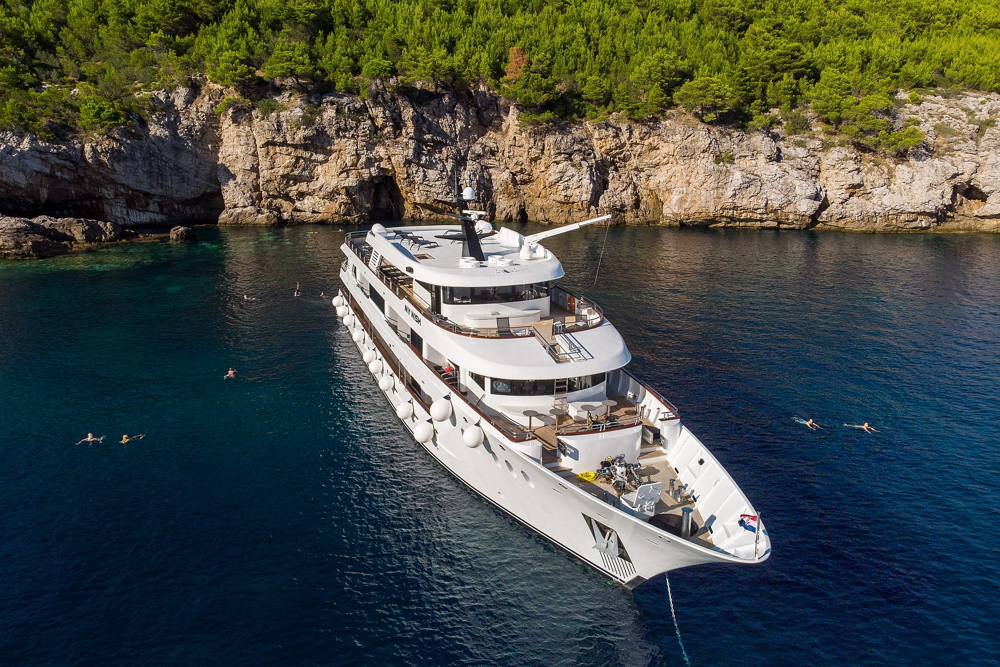 Imagine navigating the azure waters of the Adriatic aboard the streamlined 154-ft. My Wish, a ship that embodies both luxury and understated elegance. With just 18 well-appointed, air-conditioned cabins, including 10 with private balconies, and a crew-to-guest ratio of 1 to 4, this is the best way to savor the salty breeze and the captivating coastal views. The spacious sundeck boasts a hot tub for relaxing under the sun, while a convenient swimming platform offers easy access for cooling dips into Croatia’s turquoise waters during swim stops, always selected by the Captain en route for their beauty and privacy.