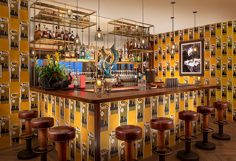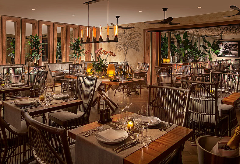 Adjacent to this literary watering hole is Bogie & Bacall’s, a restaurant that draws inspiration from multiple chapters of Hemingway’s life. Humphrey Bogart and Lauren Bacall starred in the classic 1944 film adaption of his novel To Have and Have Not—hence the name—which was originally set in Key West. The restaurant’s design vocabulary incorporates elements from all of Hemingway’s beloved locations, creating a space that feels neither like a stage set nor a conventional dining room.