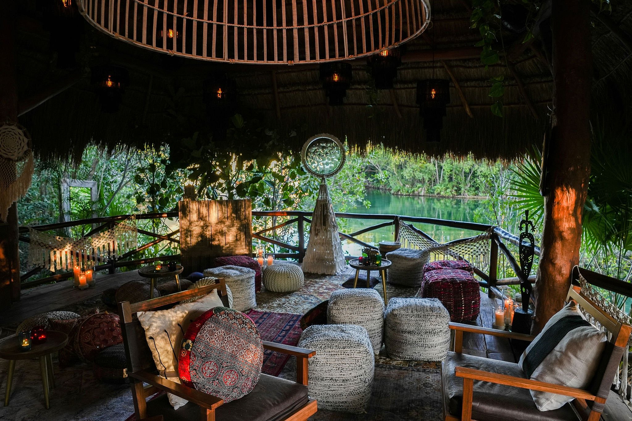 Once you disembark the boat and jump up a few steps to the island getaway, you’ll find a handful of guests reclining on pillows and loungers woven from Yucatan textiles and under woven straw chandeliers. It’s transportive figuratively and literally — the soft candles fill the space and flicker in the ocean breezes while soft noises from the surrounding jungle trickle in under the music,