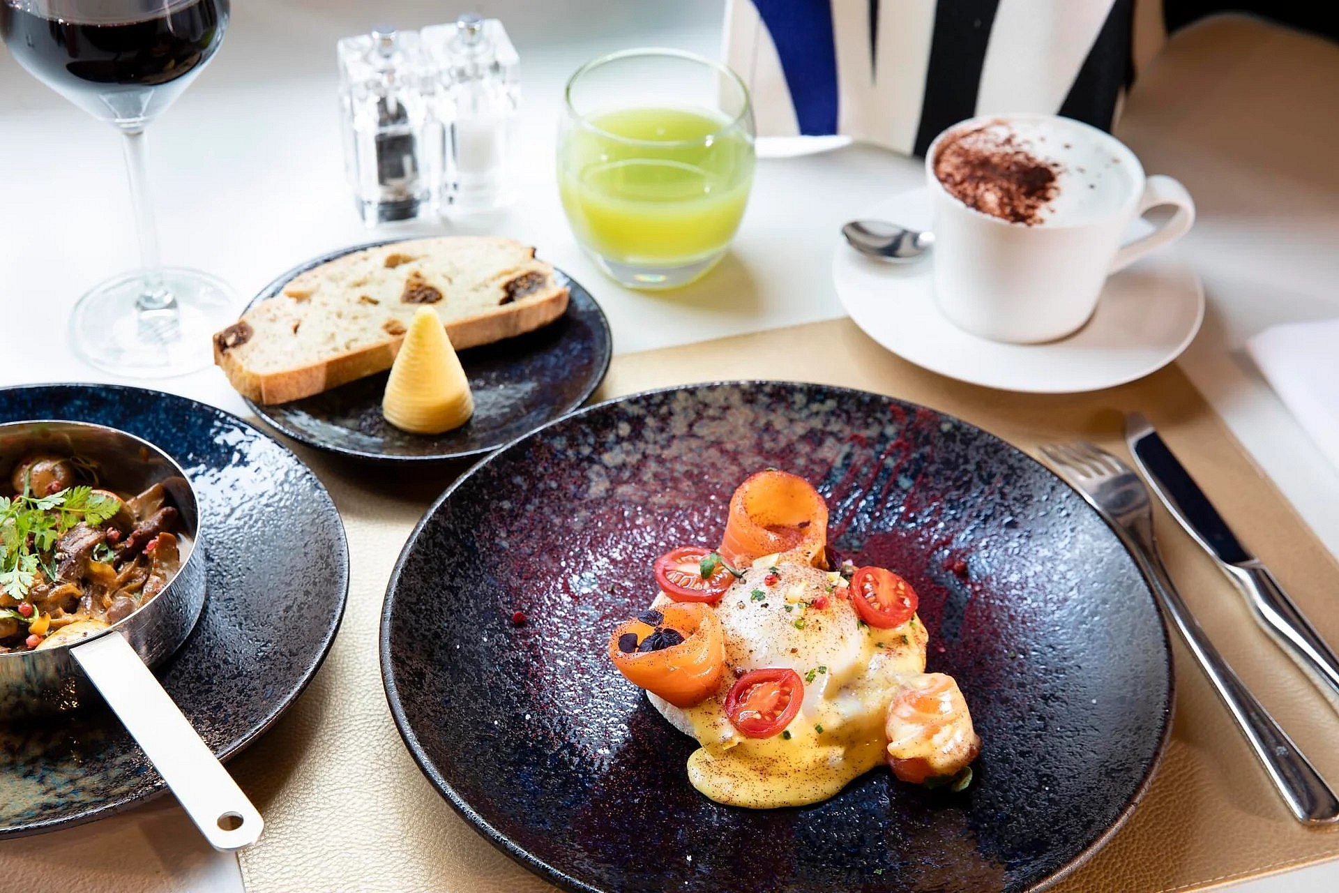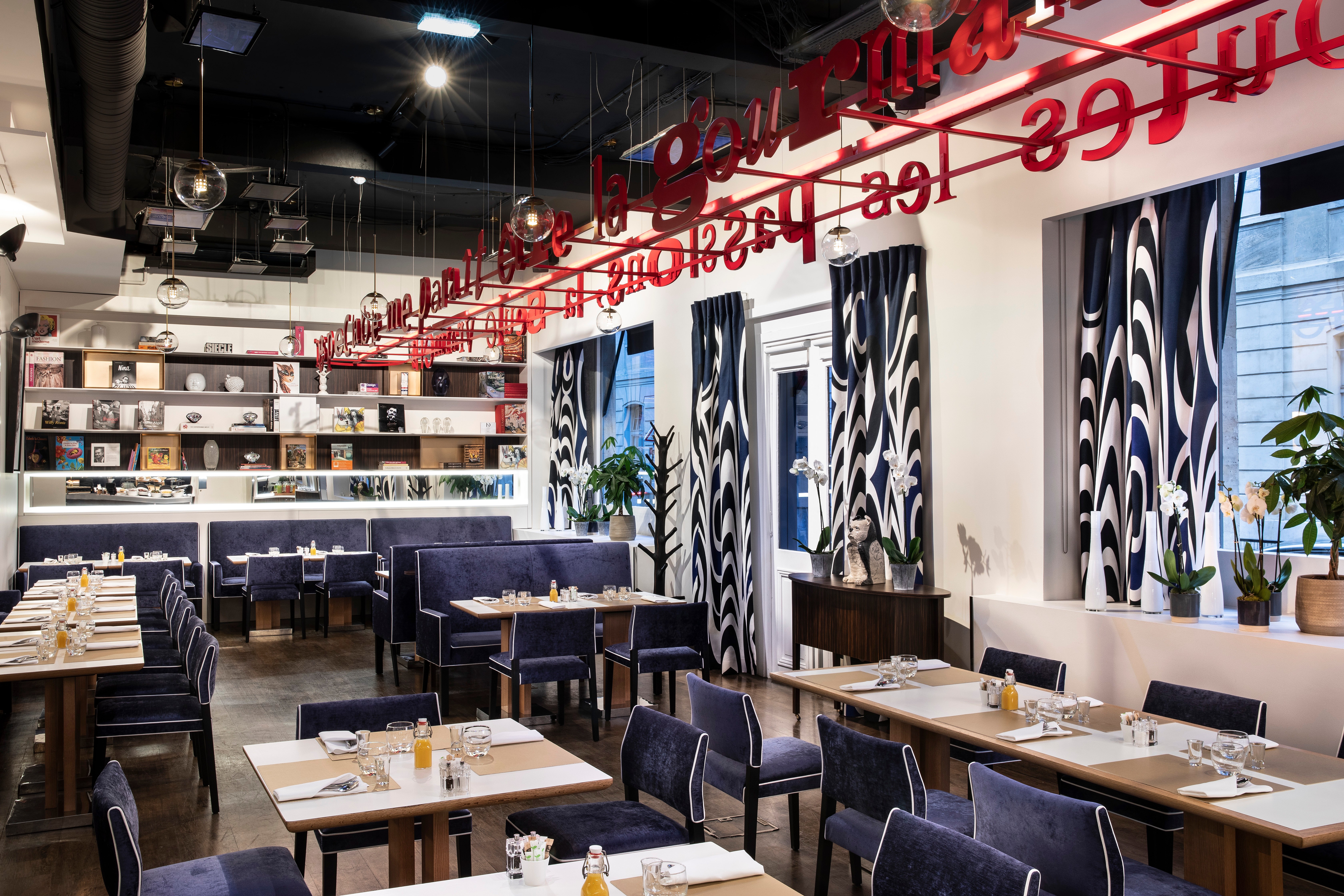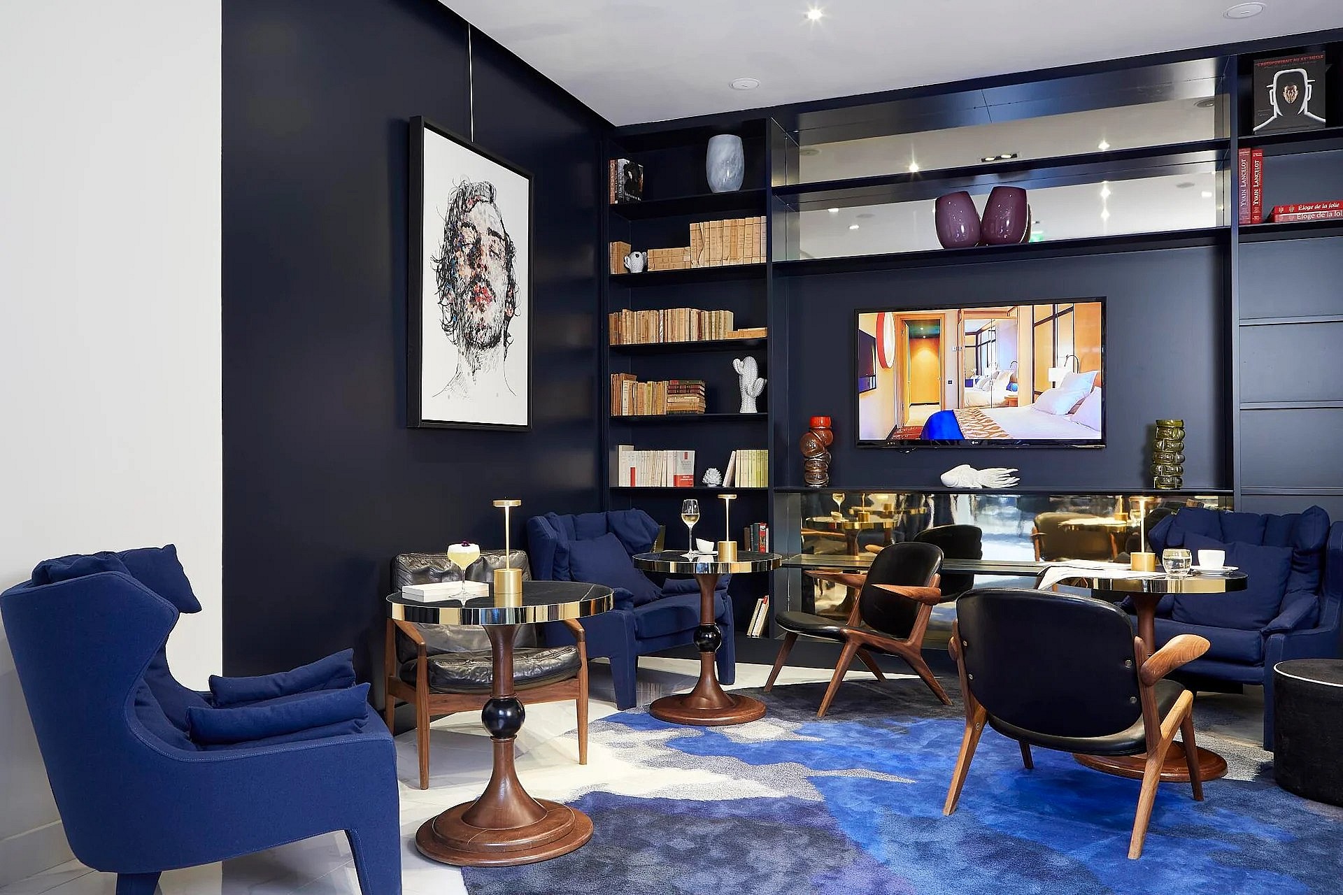 A delicious breakfast is served in the Bel Ami Café, with its large bay window and collection of art books, screens reflecting Parisian life on the ceiling, and objets d’art designed to lend the space a contemporary, cheerful and warm spirit. The signature blue elements are carried over here as well, and we have hopes that the Café might eventually extend its hours.