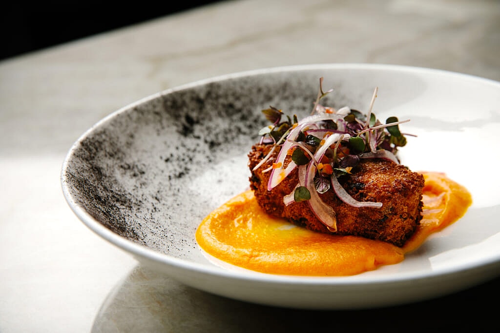 We started with a jumbo lump crab cake that was crisped to perfection, served with chili garlic aioli, pickled fennel, and shaved apple. Alongside we ordered a classic Old Fashioned, made with Woodford Reserve bourbon. Then we moved on to a Japanese certified A5 Kobe New York strip steak, accompanied by truffled whipped potatoes, charred broccolini, and a glass of Austin Hope cabernet sauvignon from Paso Robles, Calif.
