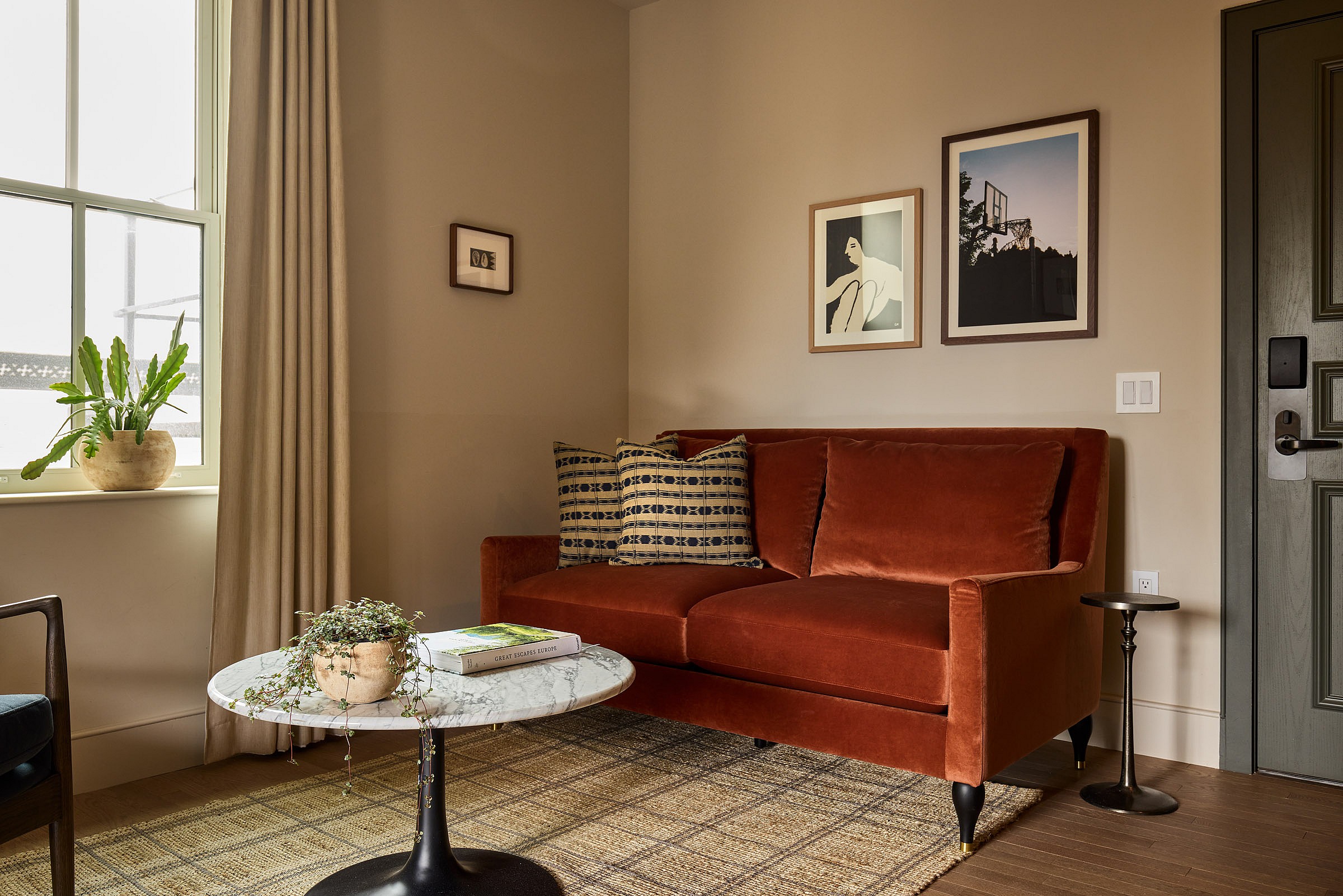 Wander past the front desk and the mansion’s original staircase, and you’ll find interiors that reflect the artistic ethos of the surrounding area with 250-plus paintings and artworks curated by Philly’s Paradigm Gallery + Studio. The eclectic vibe is further expressed with retro-style custom furnishings in velvet and linen sourced by local interior designer Sigita Stravinskaite in a warm palette of earthy hues. Here’s what else you need to know before checking into Hotel Anna & Bel: