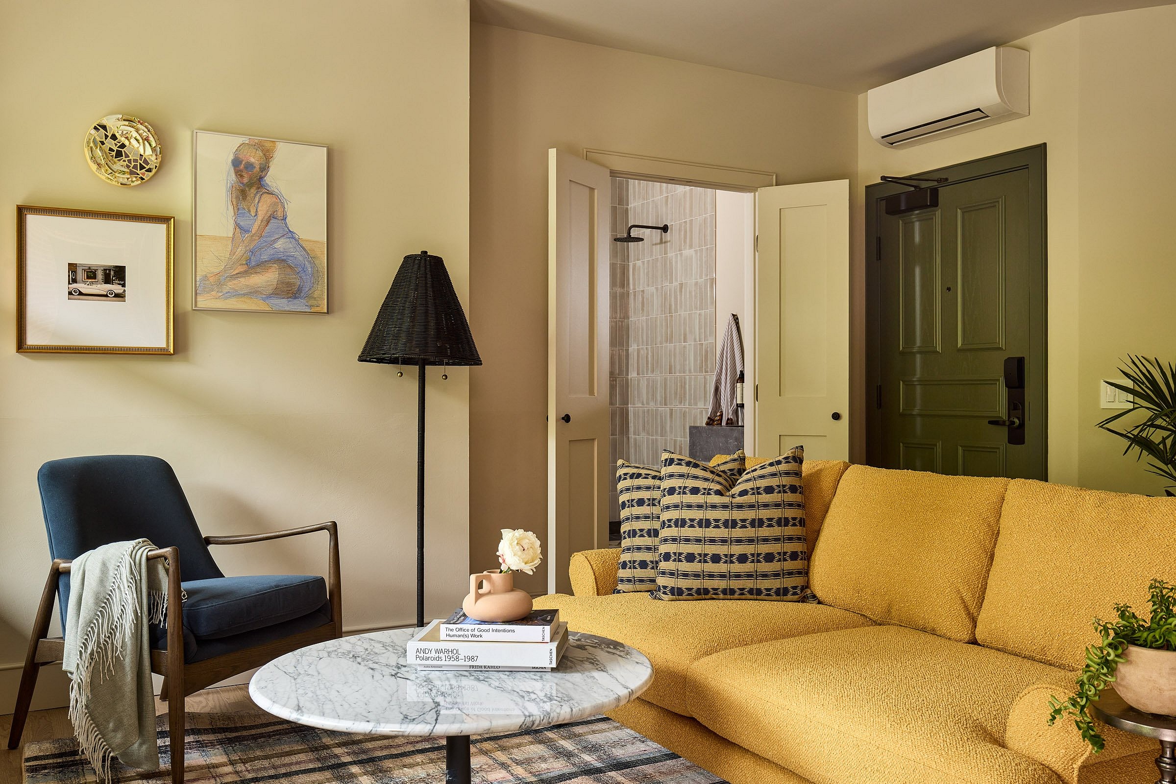 The “Amenity Closets” on every floor are stocked with extra toiletries and essentials that you may have forgotten to pack in your dopp kit—a nifty idea that the founders nicked from Manhattan’s Public Hotel. There’s a small lower-level gym with an infrared sauna and a “yoga and meditation deck” on the second floor. An extended, living room-style lobby has a fireplace, curated art and cozy seating lined with more coffee table books.
