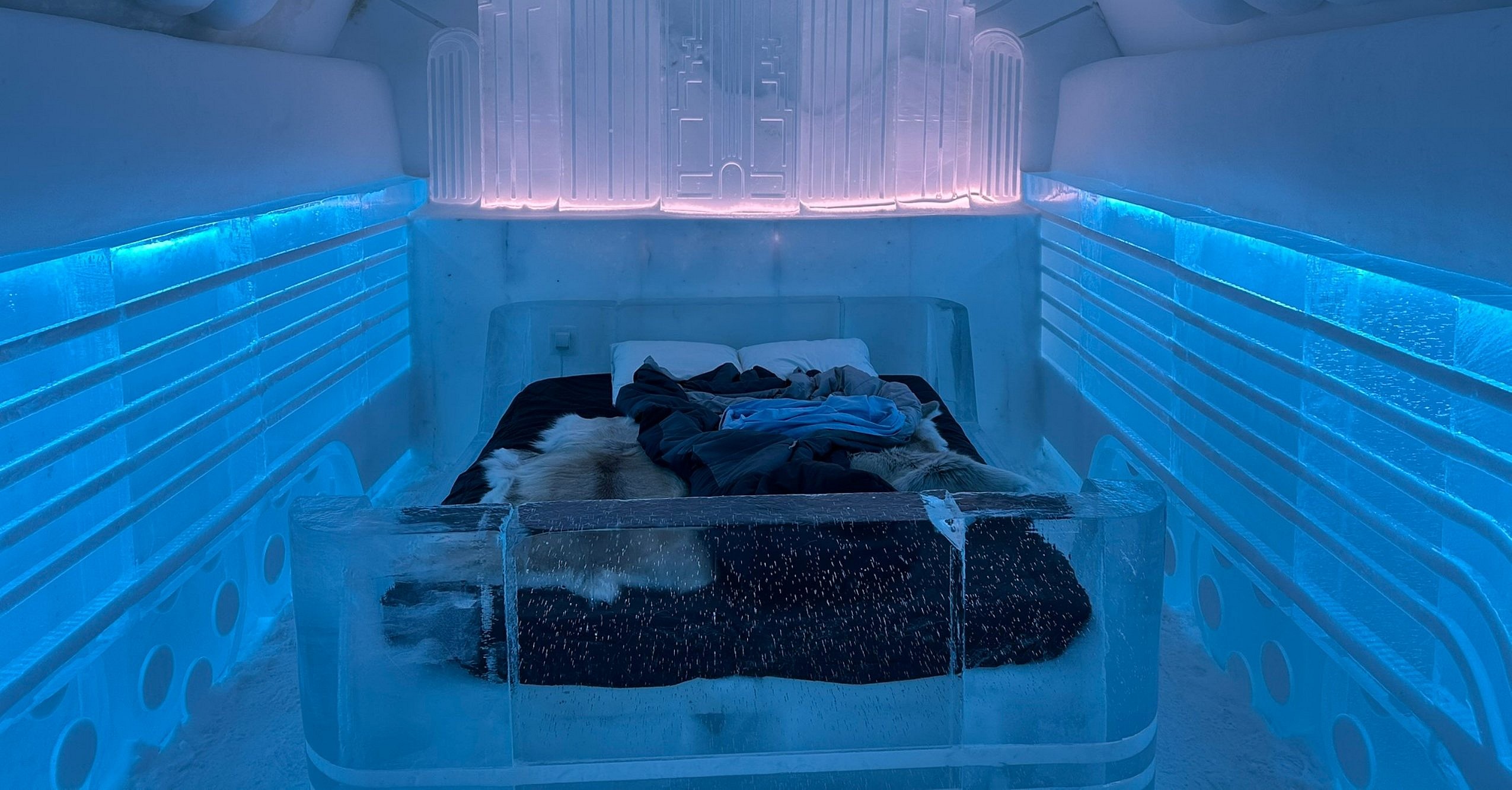 As I mentally prepared for my night on ice, I was fifteen minutes from finishing one of the best meals of my life—a 13-course Scandinavian smorgasbord of things like cloche-smoked Arctic Char and reindeer tenderloin—every course with wine pairings. The contrast between where I’d been and where I was headed was stark. Reaching my room, I drew back the thick curtain that served as a door and walked into an Art-Deco-inspired room titled “Yesterday’s Tomorrow,” created by South African designers Corban Warrington and Daniel Afonso. It was a futuristic vision of a hypothetical world in which Art Deco never ended; stunning to look at, but quite another thing to sleep in.