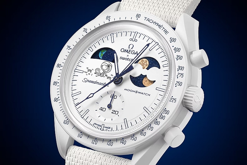 As with other editions, Woodstock and Snoopy adorn the Earthphase portion of the dial in playful fashion, while the Moonphase indicator features “radiant full moons” finished with proprietary Omega Moonshine Gold, according to Swatch, and one is even done in a drawing style similar to the world of Snoopy.