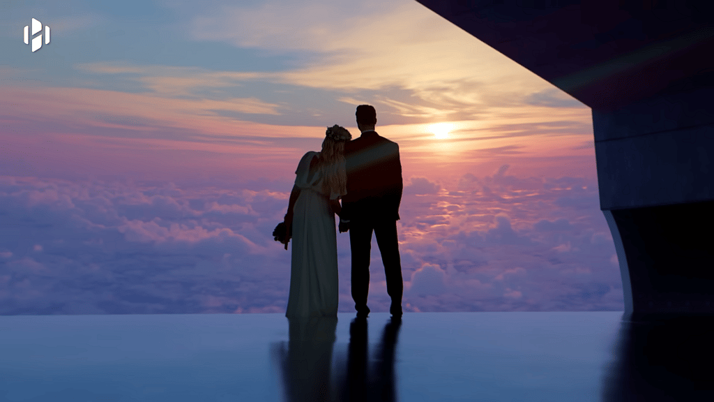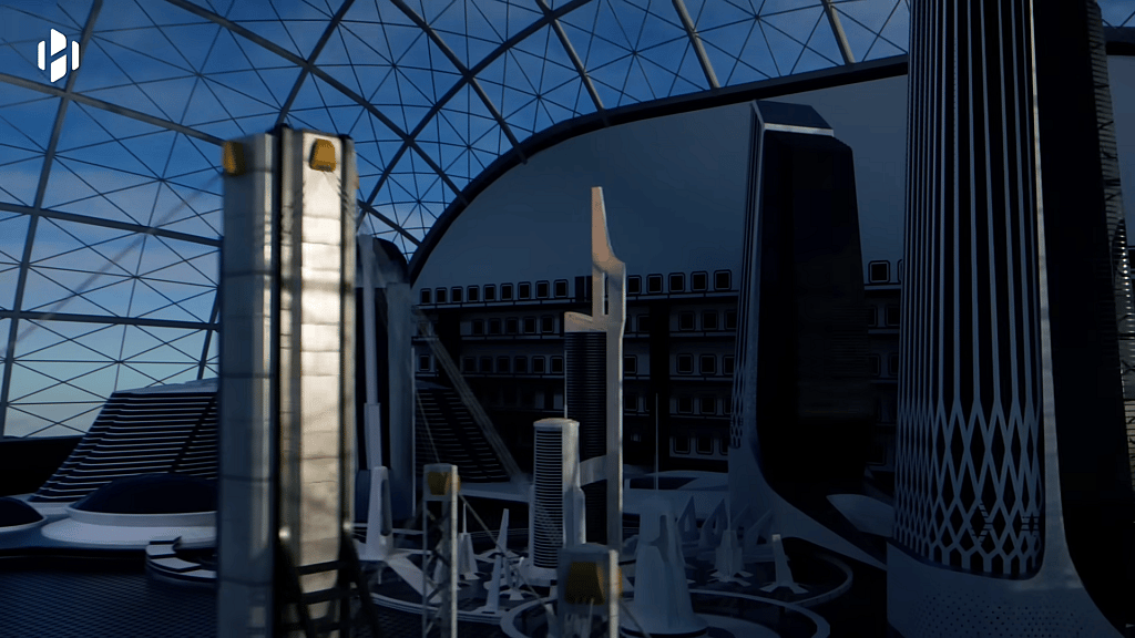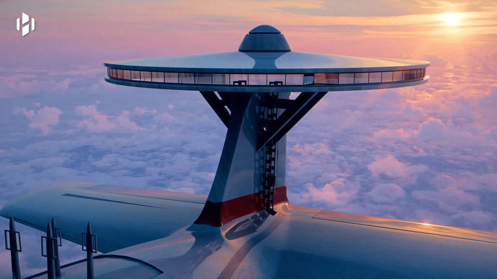 Conceived by artist Tony Holmstem and animated by Hashem Al-Ghaili, the craft is effectively flying cruise ship with accommodations for 5,000 guests. The selling point for vacationers is the scenery, something that is taken full advantage of by the Sky Cruise’s elevated panoramic viewing deck, external elevators, and six balconies with viewing domes.