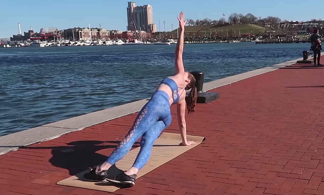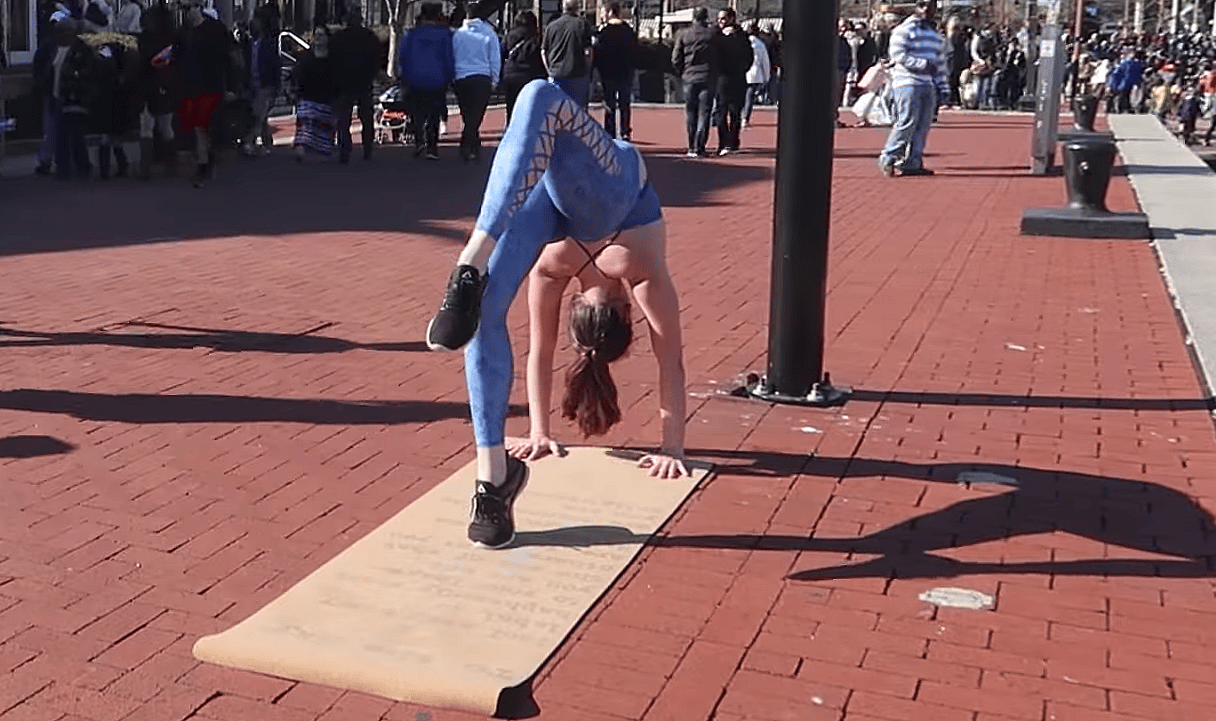 We’ve already witnessed Jen and her body-painted posse embark on technically nude Tinder dates and eye-popping shopping sprees. For her latest social experiment, Jen recruited her pal Ali to hit the busy Inner Harbor district in Baltimore, Md. to strike yoga poses wearing nothing more than painted-on blue activewear.