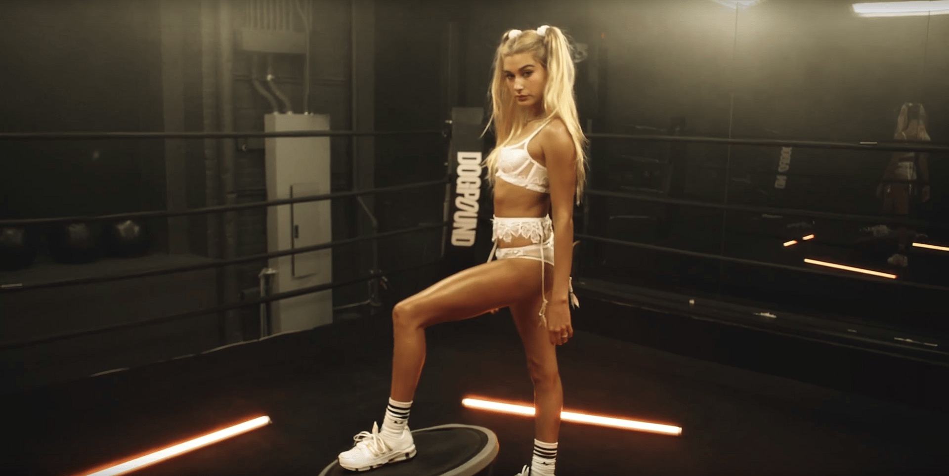 Fashion photographer Phil Poynter directed the women as they get their workout on with weights, exercise bikes and a little MMA-style submission training.